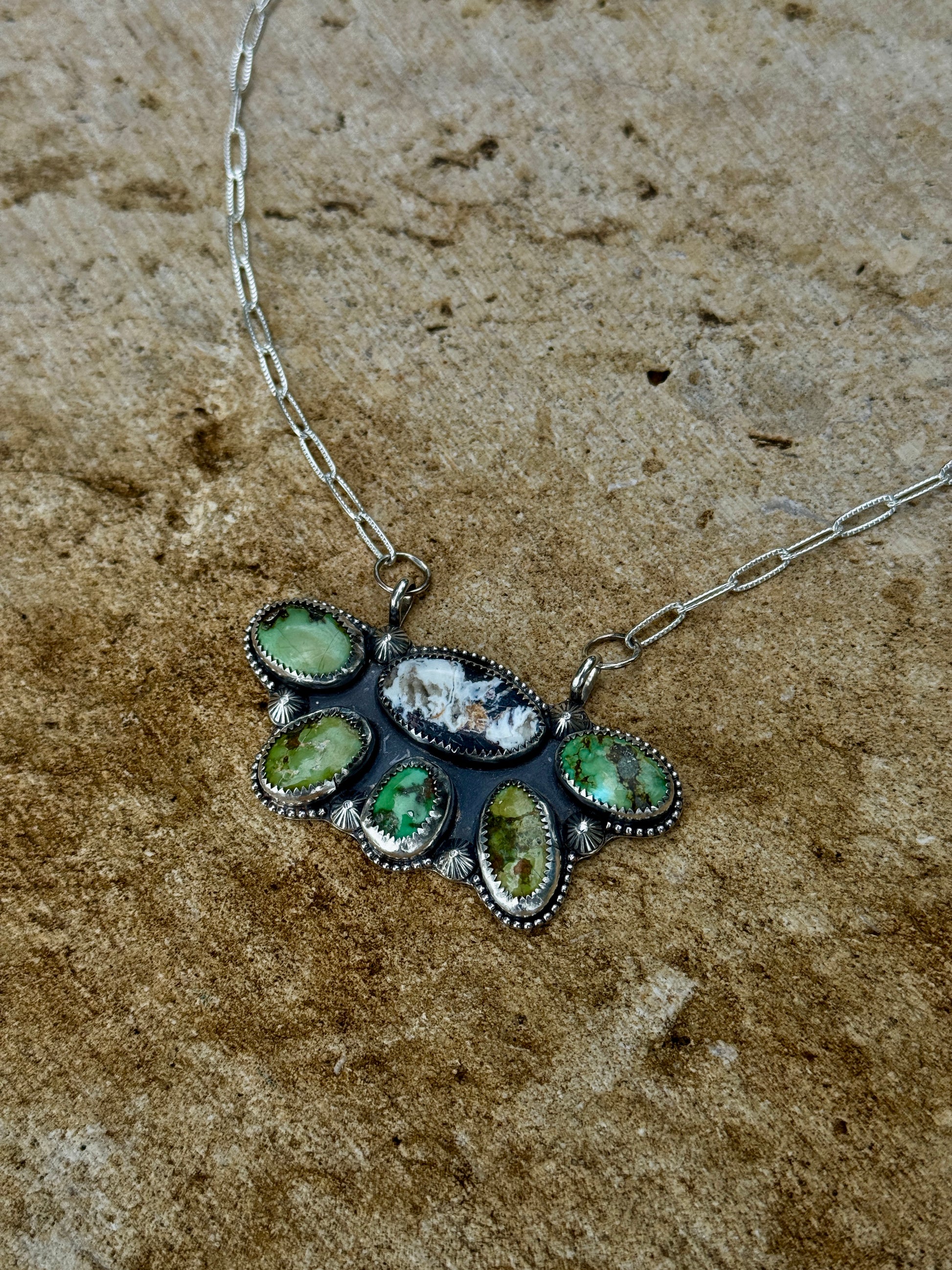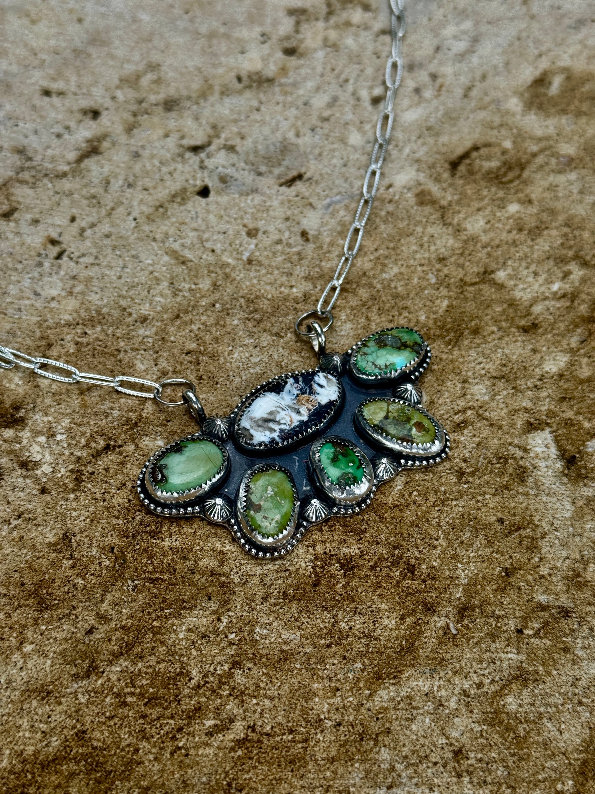 This handcrafted sterling silver necklace showcases the striking contrast of vivid Sonoran turquoise and the rare, timeless beauty of White Buffalo stone. Each gem is set with hand-cut bezels and accented with fine silver details, creating a one-of-a-kind piece that embodies the spirit of the Southwest.