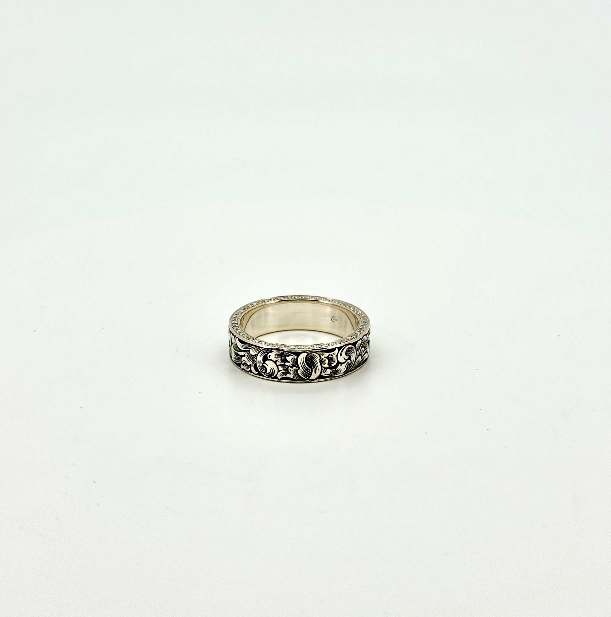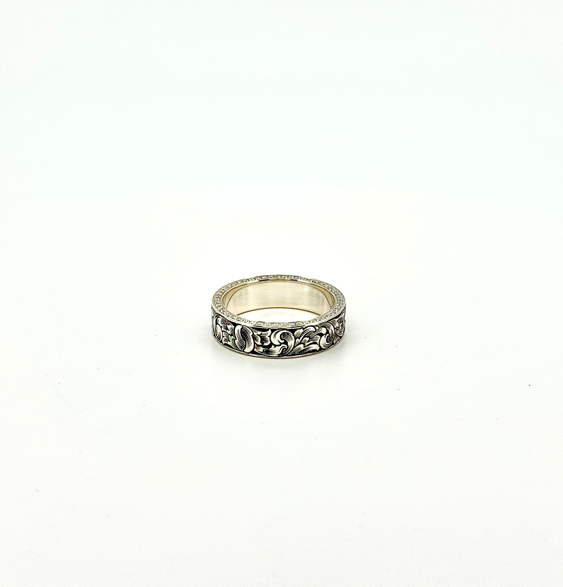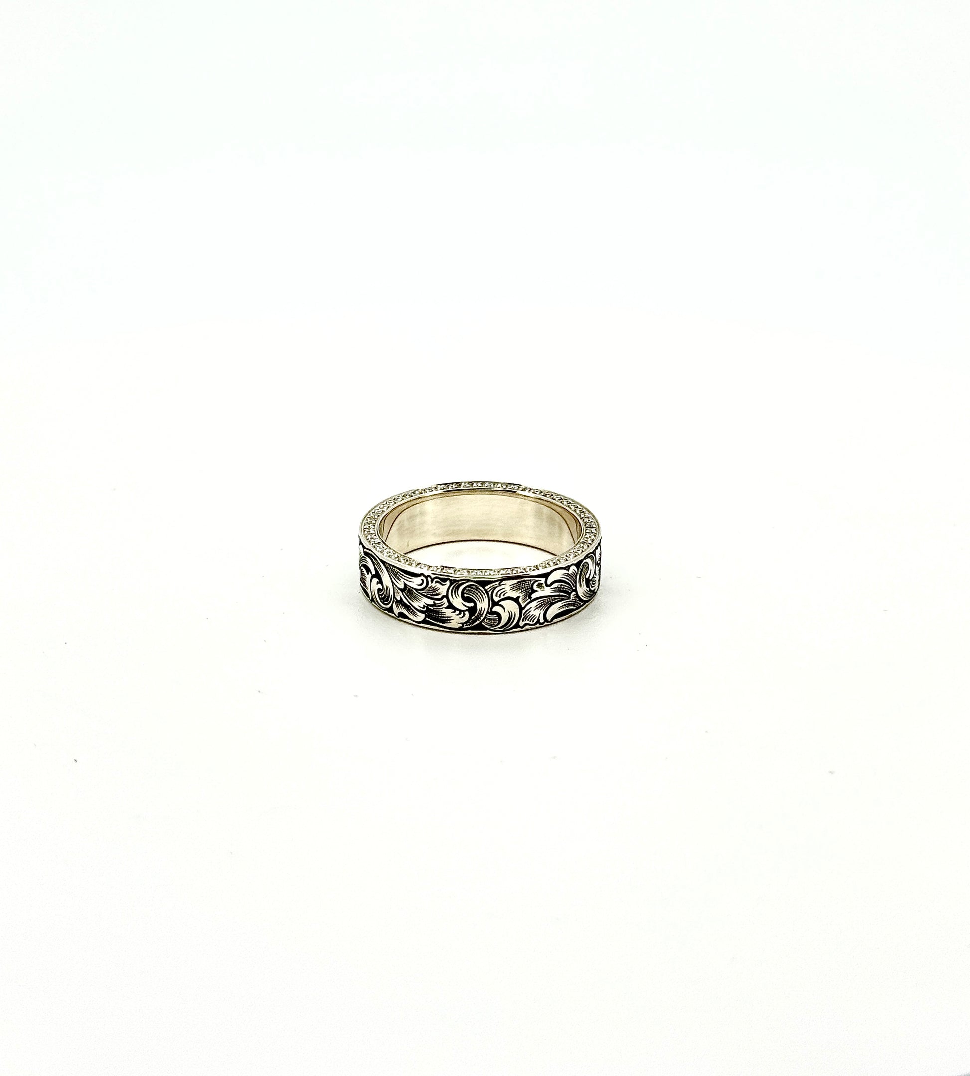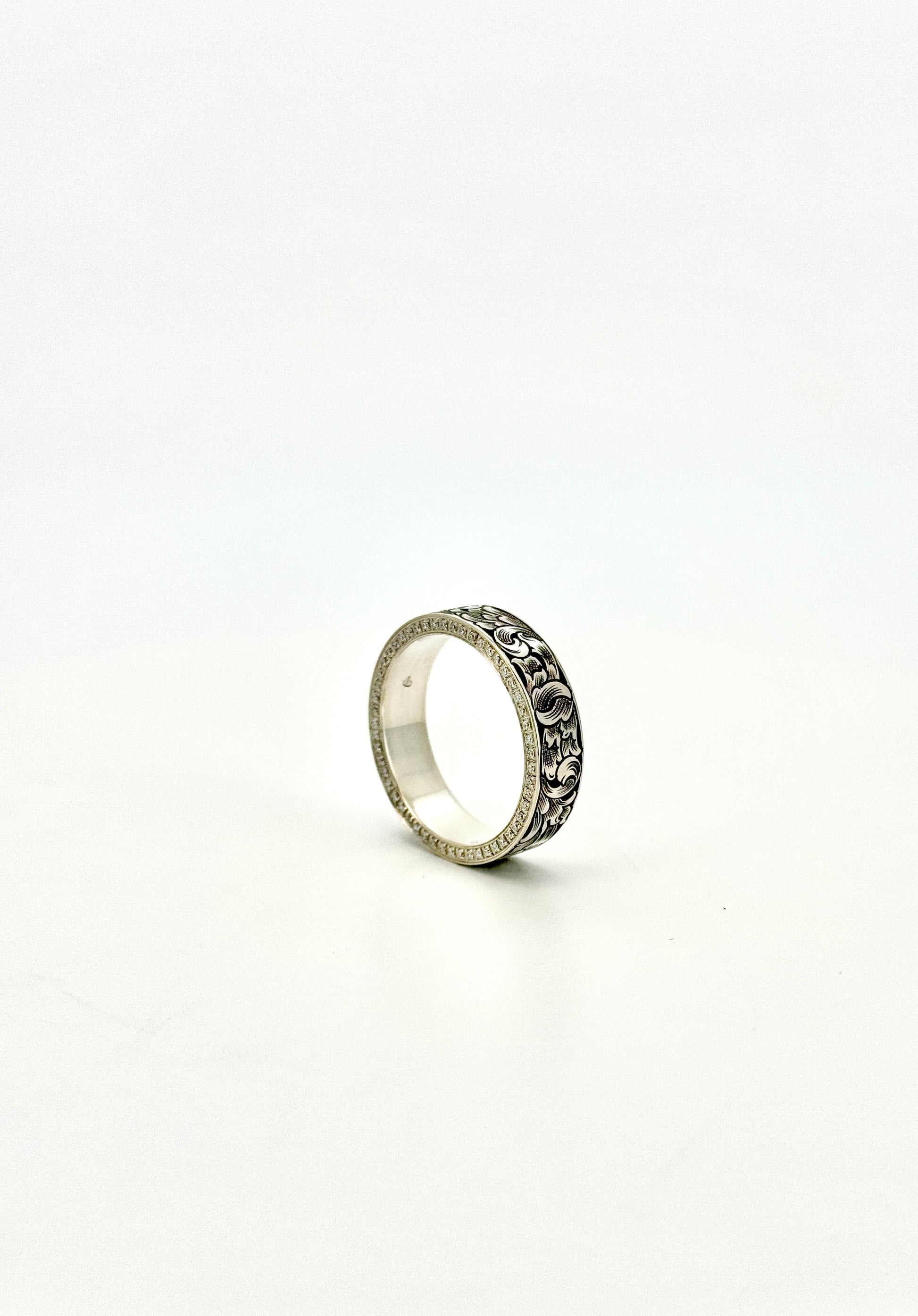 Crafted in Continuum silver, this size 10 wedding band is a true union of artistry and elegance. The band is hand-engraved with flowing deep relief scrollwork, each detail cut with precision to create a piece that feels alive with movement and depth. Encircling the band are 106 diamonds, adding a subtle brilliance that complements the classic silver design without overpowering its engraved beauty.