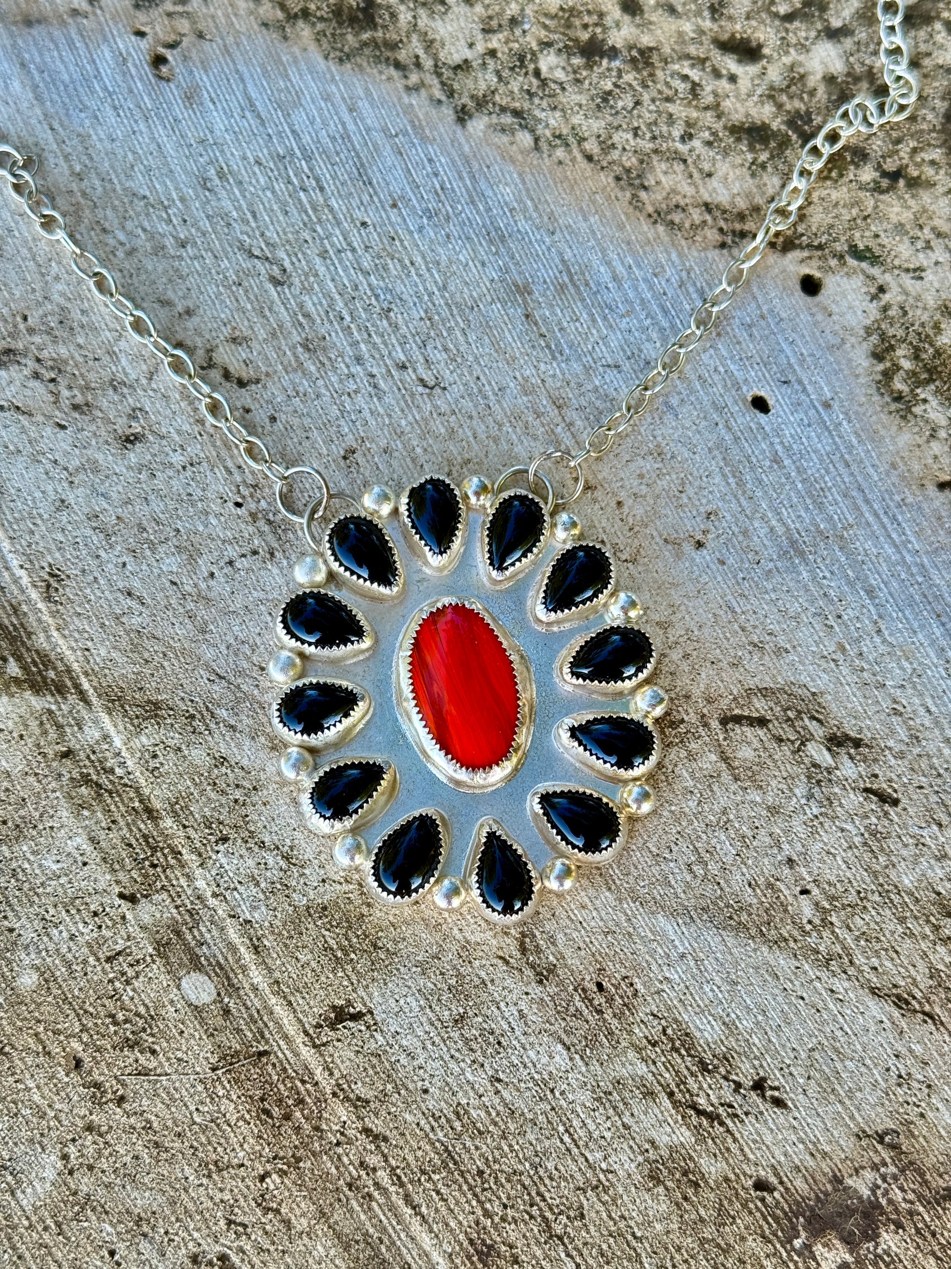 A striking necklace that captures the beauty of contrast. Handcrafted in sterling silver, it features deep black onyx petals radiating around a vivid rosarita center, accented with silver balls, like a rare flower blooming beneath the night sky. Elegant, bold, and timeless.