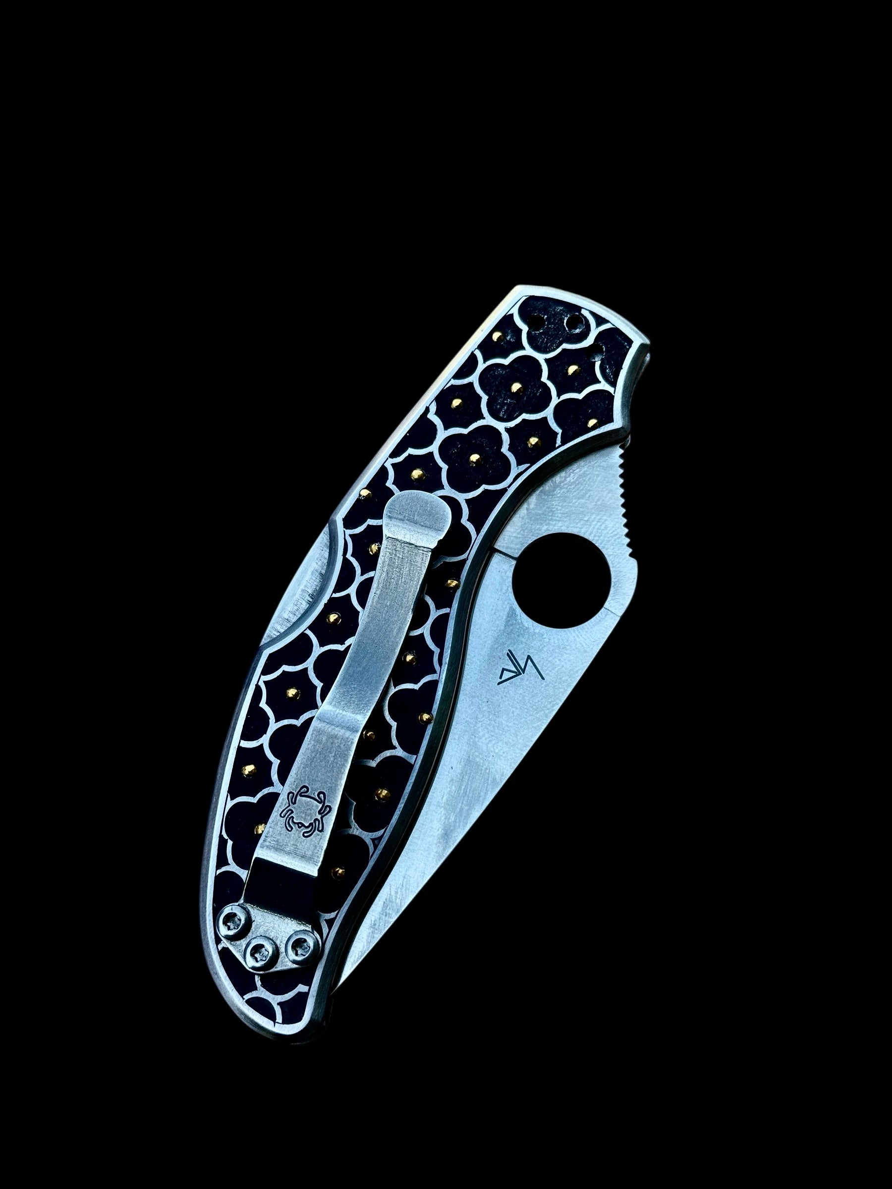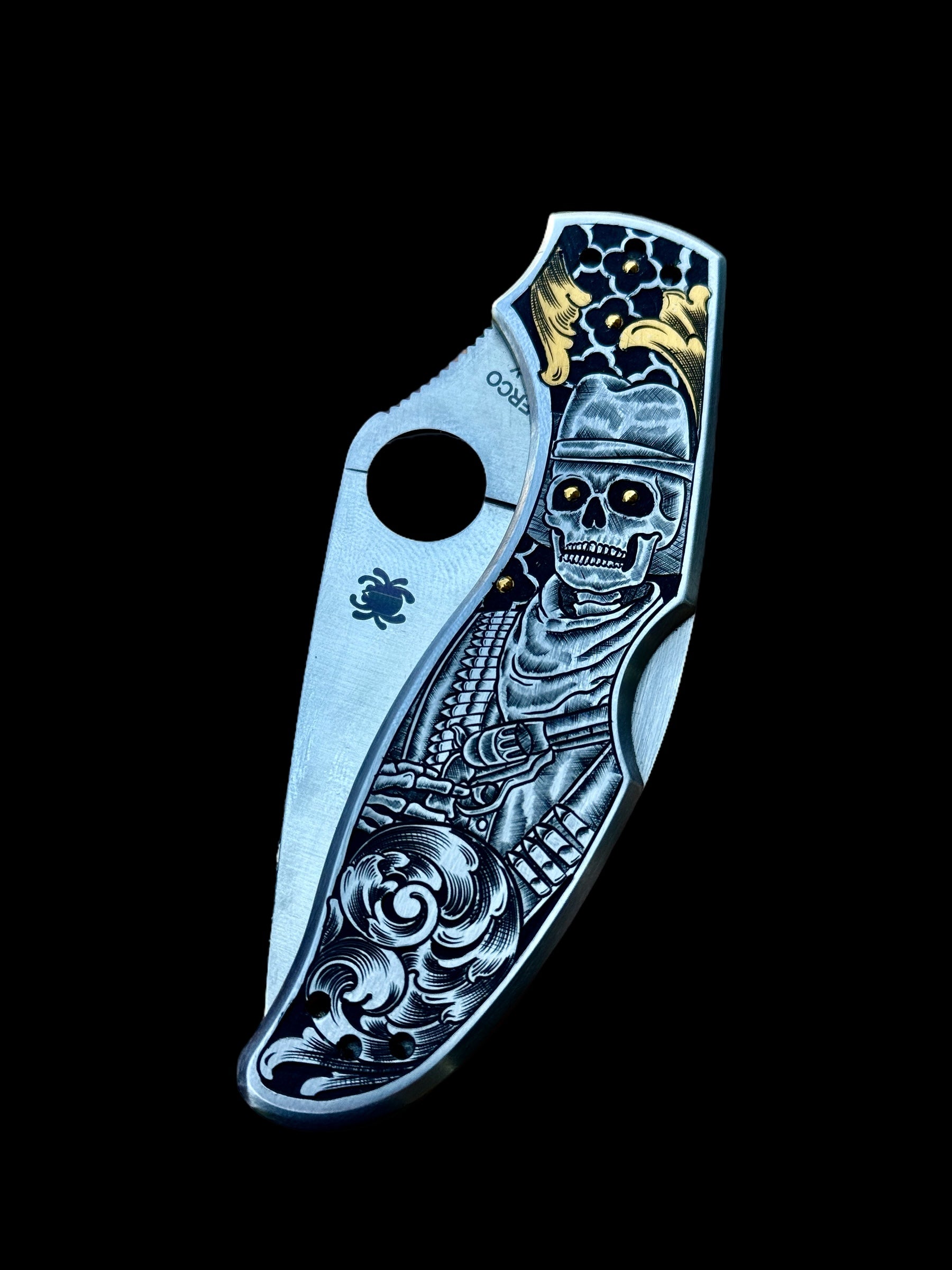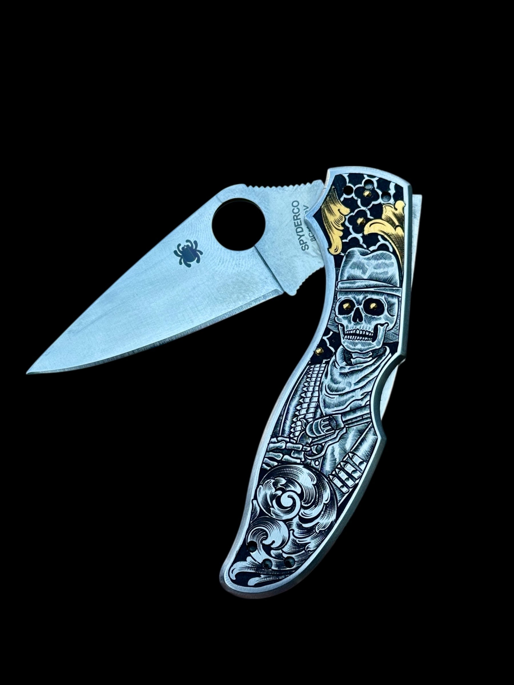 A one-of-a-kind engraved Spyderco, hand-carved in deep relief with a skeleton gunslinger standing watch for eternity. Darkened background and bold scrollwork frame the figure, accented with 24k gold inlay — flowing leaves on the front and precise gold dots throughout. A fusion of Western grit and fine luxury engraving, this piece carries the weight of legend in steel and gold.